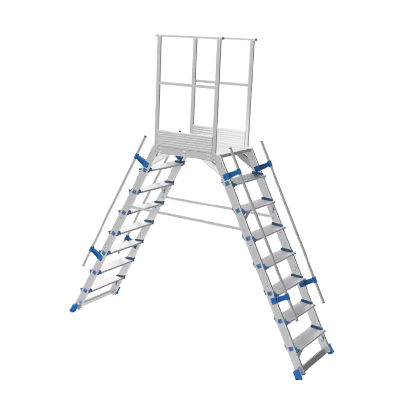سلم بونتي المصنوع من الألومنيوم والمزود بمنصة، يتميز بإمكانية الوصول المزدوج، ومنصة مانعة للانزلاق بمقاس 800×600 مم، وحواجز جانبية بارتفاع 110 مم، وقاعدة مزدوجة عريضة ومتينة. يحتوي على درابزين لسهولة الصعود والنزول، وهو مثالي لخطوط الإنتاج وتجاوز العوائق. درجات مريحة بارتفاع 165 مم.
