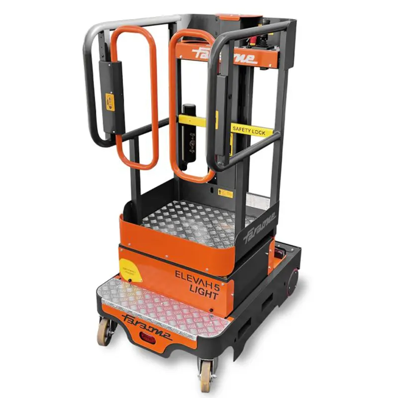 Plate-forme automotrice très légère avec élévation électrique jusqu’à 5 m. Si vous cherchez une solution idéale pour les sols délicats ou peu résistants (mezzanines), notre nacelle Elevah 5 Move Light est idéale. C’est une plateforme très légère (400 kg seulement) et peu encombrante, facile à transporter par tous les moyens, même dans un ascenseur. Sa compacité : elle est parmi les plus compactes du marché. Sa manette de commande pour une conduite avec une seule main. Son rayon de braquage nul permet à l’opérateur de travailler de manière rapide et confortable aussi dans les surfaces plus étroites et de conduire facilement avec peu de marge de manœuvre, même en 95 cm seulement. Son système automoteur en hauteur. Elle peut être déplacée sans devoir abaisser le panier, ce qui permet de gagner du temps lors des opérations. Son accès confortable et sûr permet à l’opérateur de travailler en hauteur en étant protégé de tous les côtés, minimisant le risque d’accident.