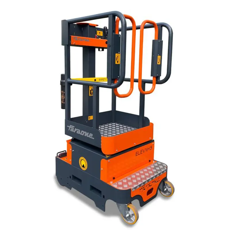 Si vous cherchez une solution compacte et sûre pour les travaux en hauteur, cette nacelle offre un accès confortable et sûr et permet à l’opérateur de travailler en hauteur en étant protégé de tous les côtés, minimisant le risque d’accident. Elle est idéale pour la maintenance industrielle. Sa compacité : Elevah 5 Move est la plus compacte du marché. Avec seulement 70 cm de largeur, elle peut être utilisée dans les espaces les plus étroits. Sa manette de commande pour une conduite avec une seule main. Grande maniabilité. Son rayon de braquage nul : elle tourne à 360° et elle peut se déplacer dans les espaces les plus étroits, même en 95 cm seulement. Son système automoteur en hauteur. Elle peut être déplacée sans devoir abaisser le panier, ce qui permet de gagner du temps lors des opérations. Son accès confortable et sûr permet à l’opérateur de travailler en hauteur en étant protégé de tous les côtés, minimisant le risque d’accident. Dans la section équipements et accessoires, vous trouverez une liste de composants standards et d’accessoires pour personnaliser l’Elevah E5 Move, en l’adaptant à vos besoins. Radar anticollision frontal, de recul et au plafond. Plateau porte-outil amovible – 30 x 70 cm – Charge maximale 40 kg. Desserrage manuel du frein de stationnement électronique automatique. Cela permet de déplacer manuellement la machine automotrice. Protection anti-écrasement sous le panier. Serrure de porte automatique. Batteries AGM haute résistance Trojan 24V – 100A.